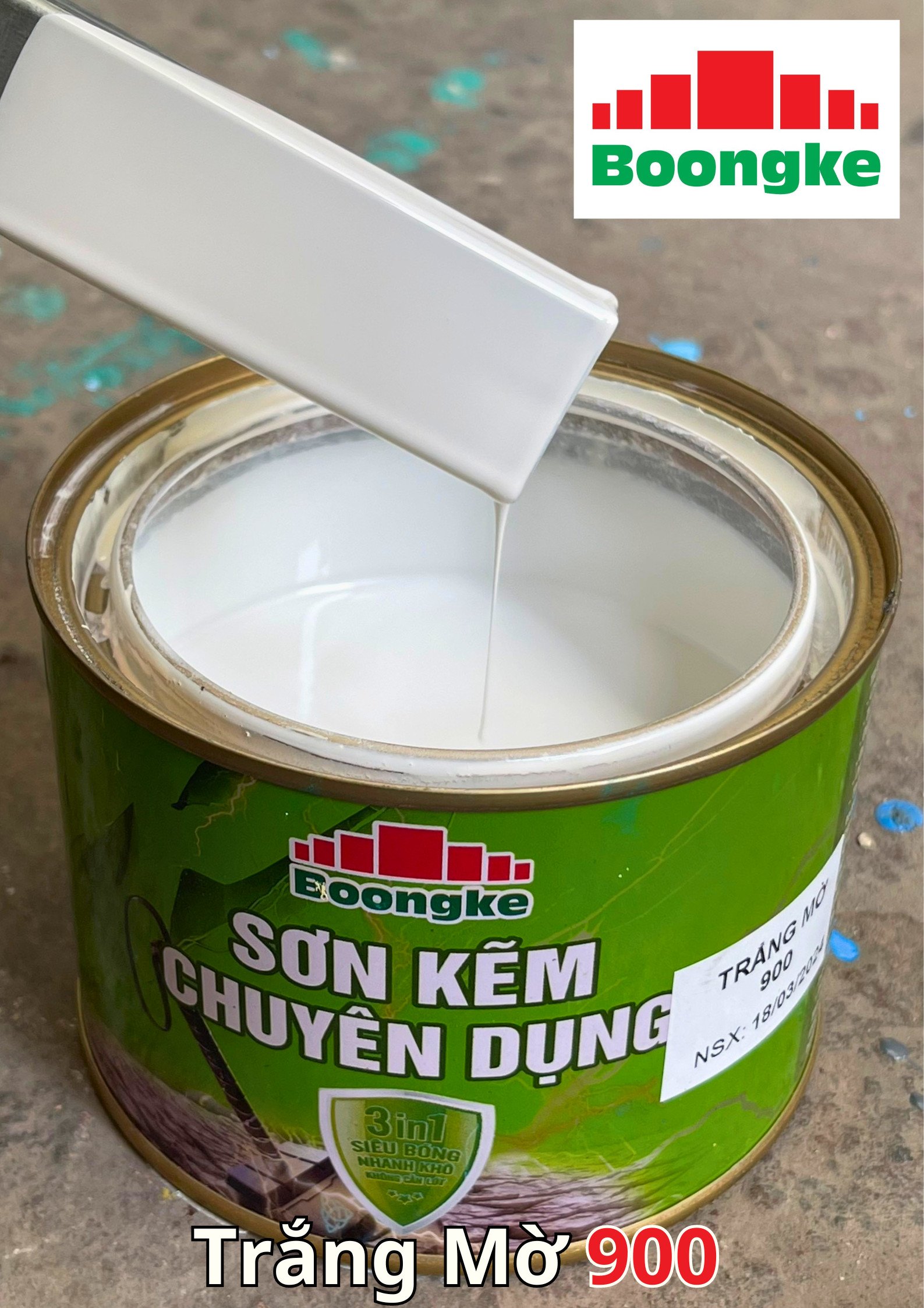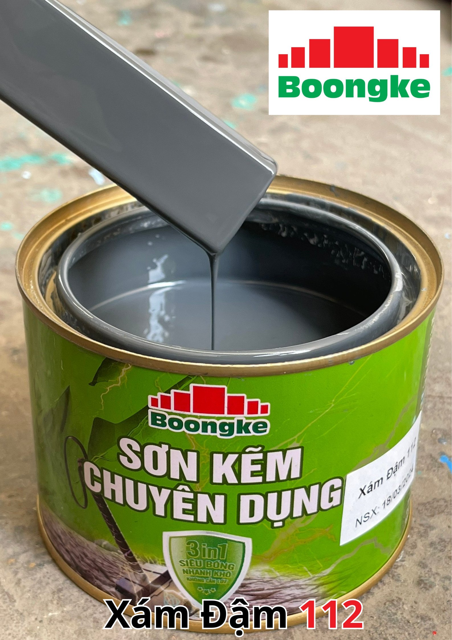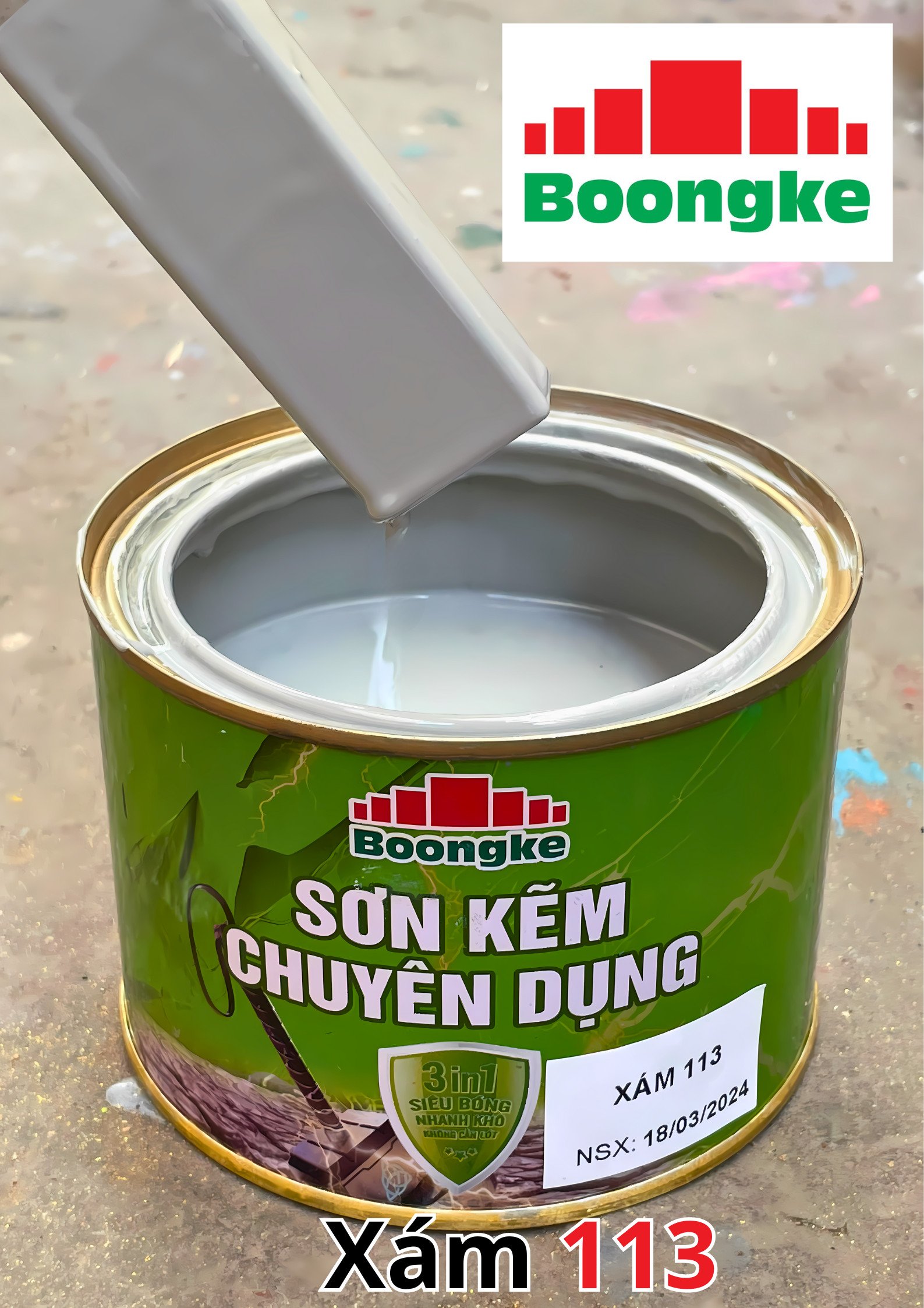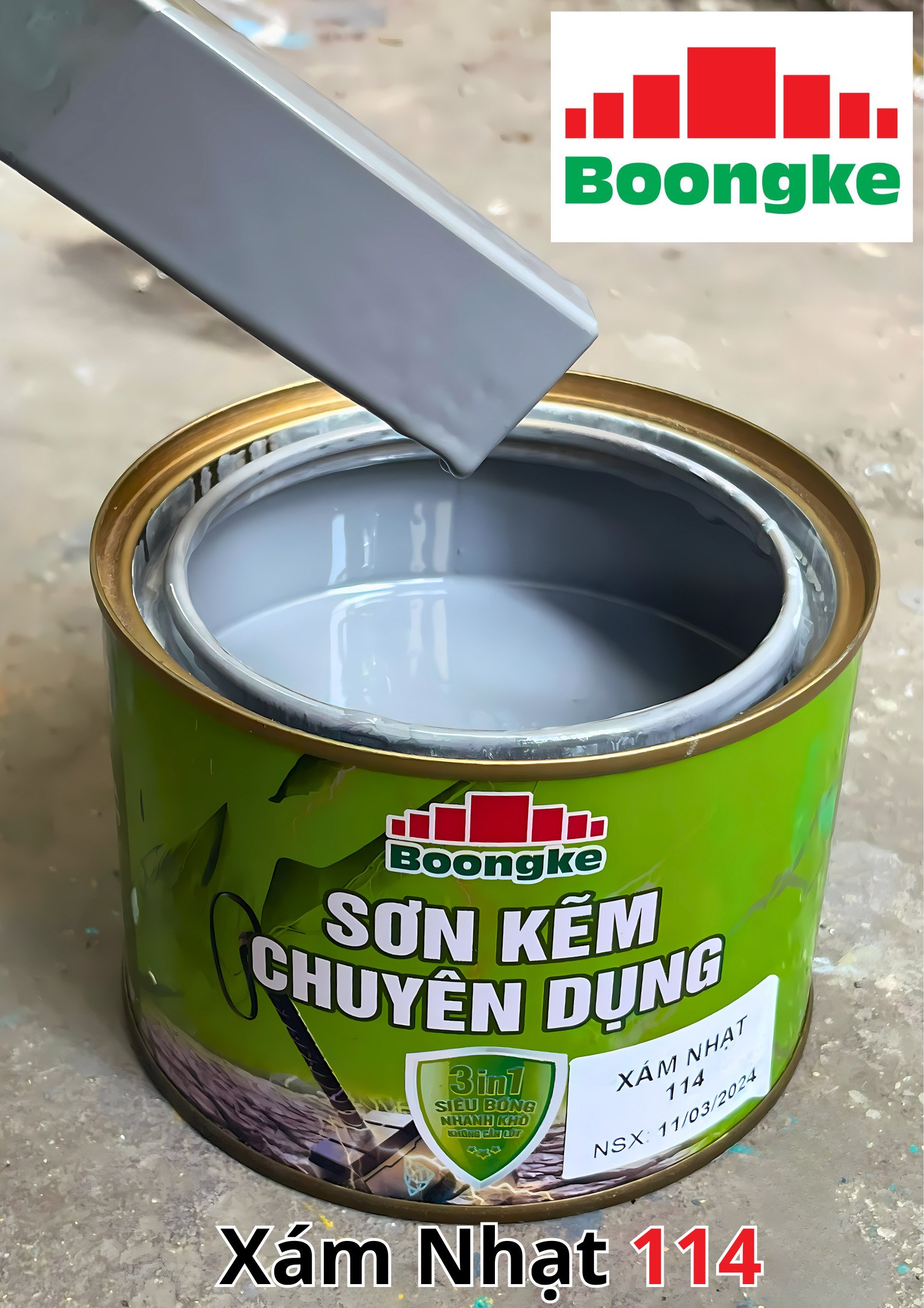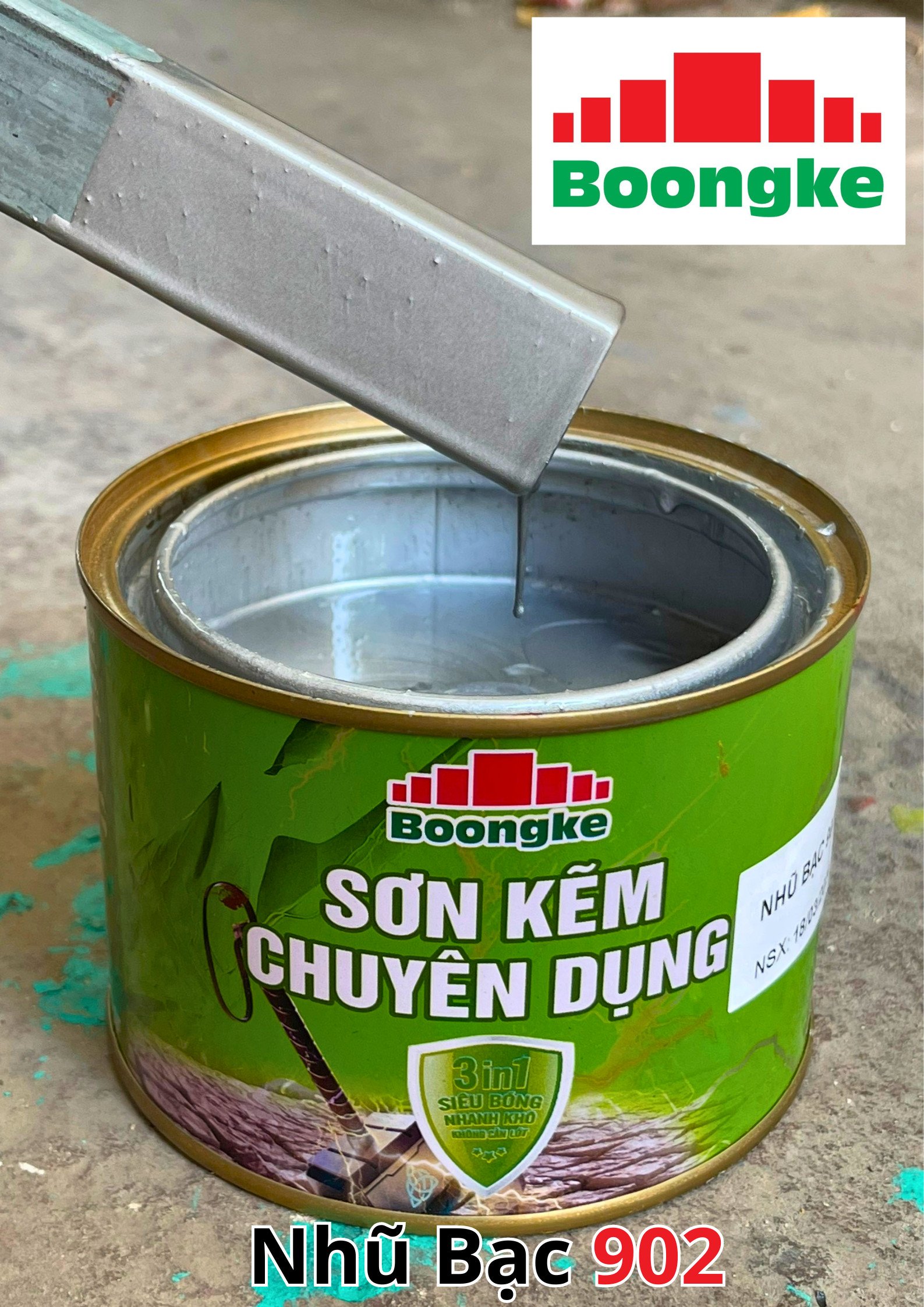 SƠN KẼM SIÊU BÓNG 1 THÀNH PHẦN SIÊU BÓNG BOONGKE Là loại sơn tổng hợp đặc biệt dùng cho việc bảo vệ bề mặt khó bám dính như thép mạ kẽm, betong, gỗ, kính,… sử dụng trong các công trình như nhà thép, cổng sắt, cửa sắt, bảo vệ, chống rỉ, sơn cho tole mạ kẽm, inox, gỗ…Sơn phủ màu trực tiếp lên bề mặt, không cần sơn lót.