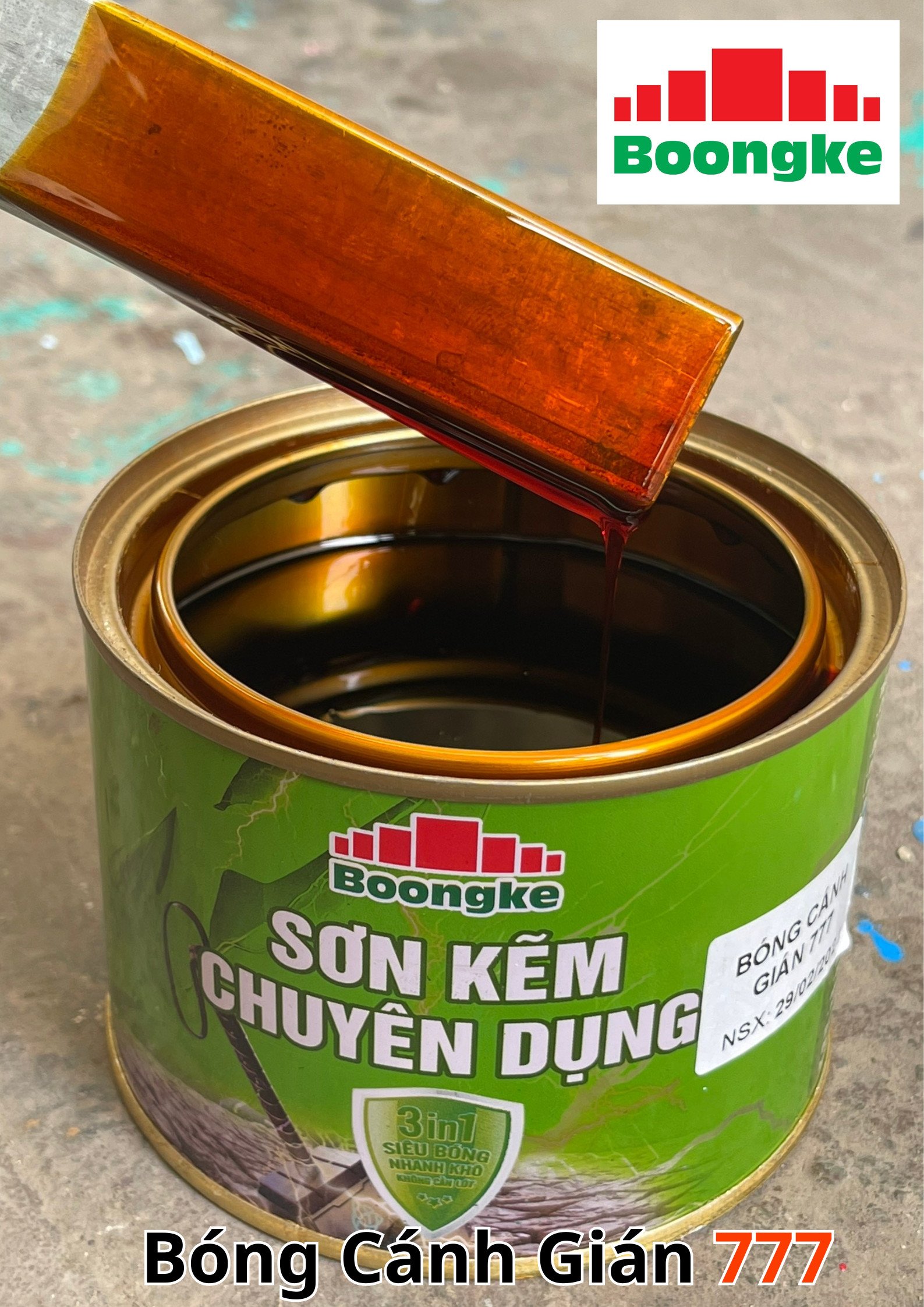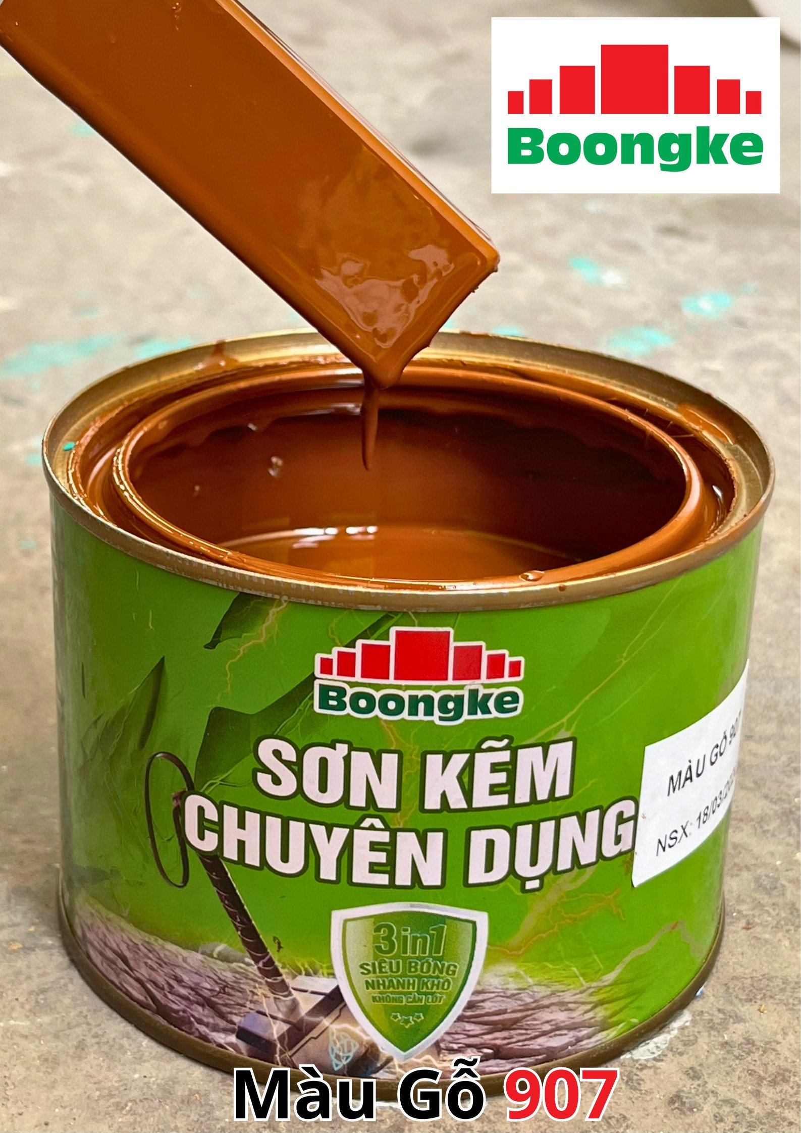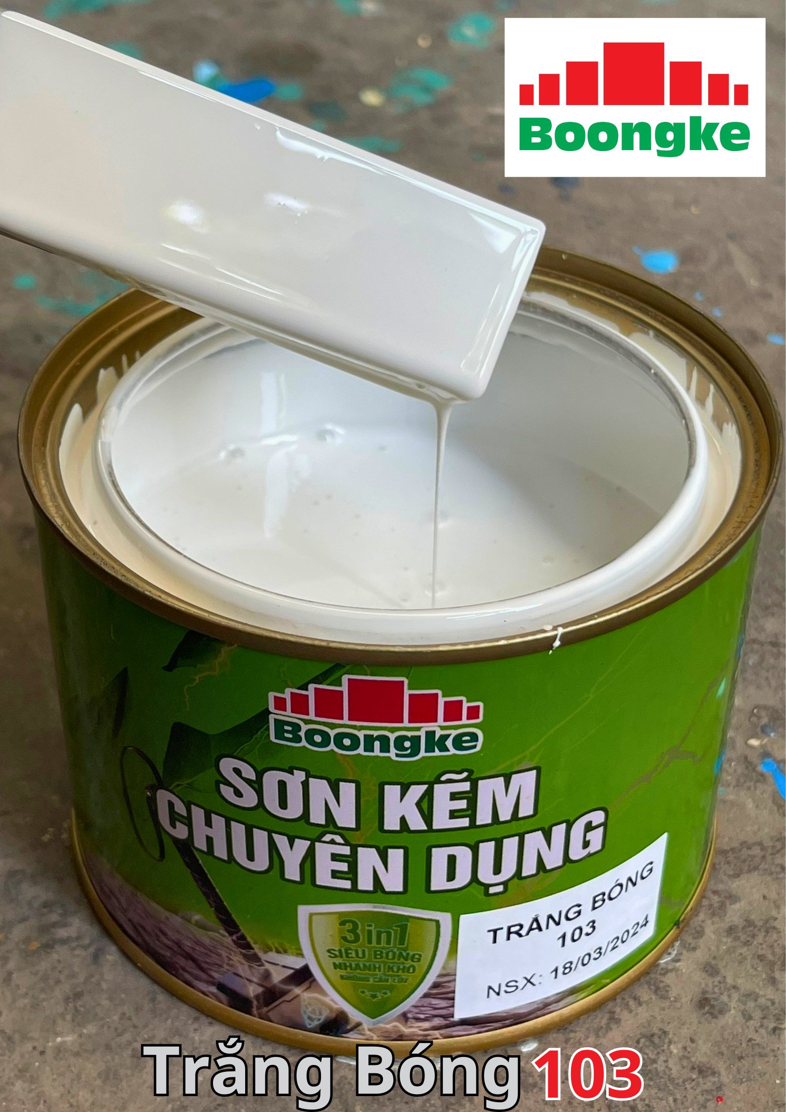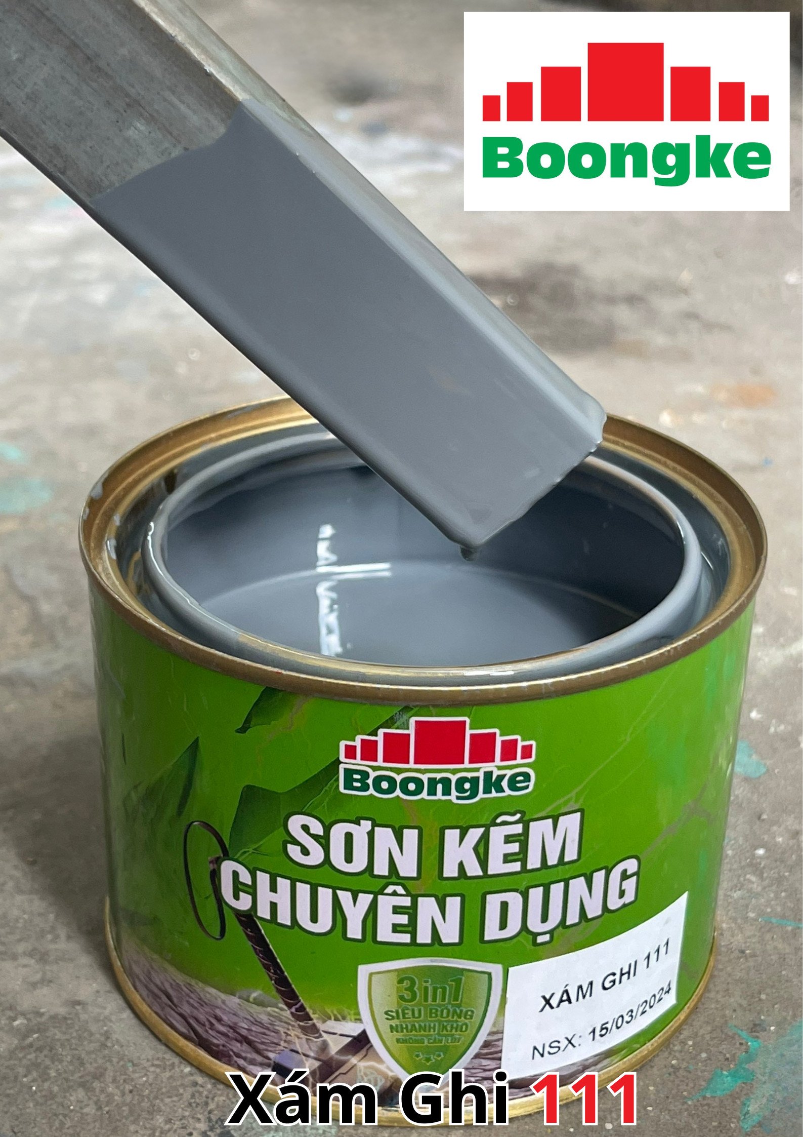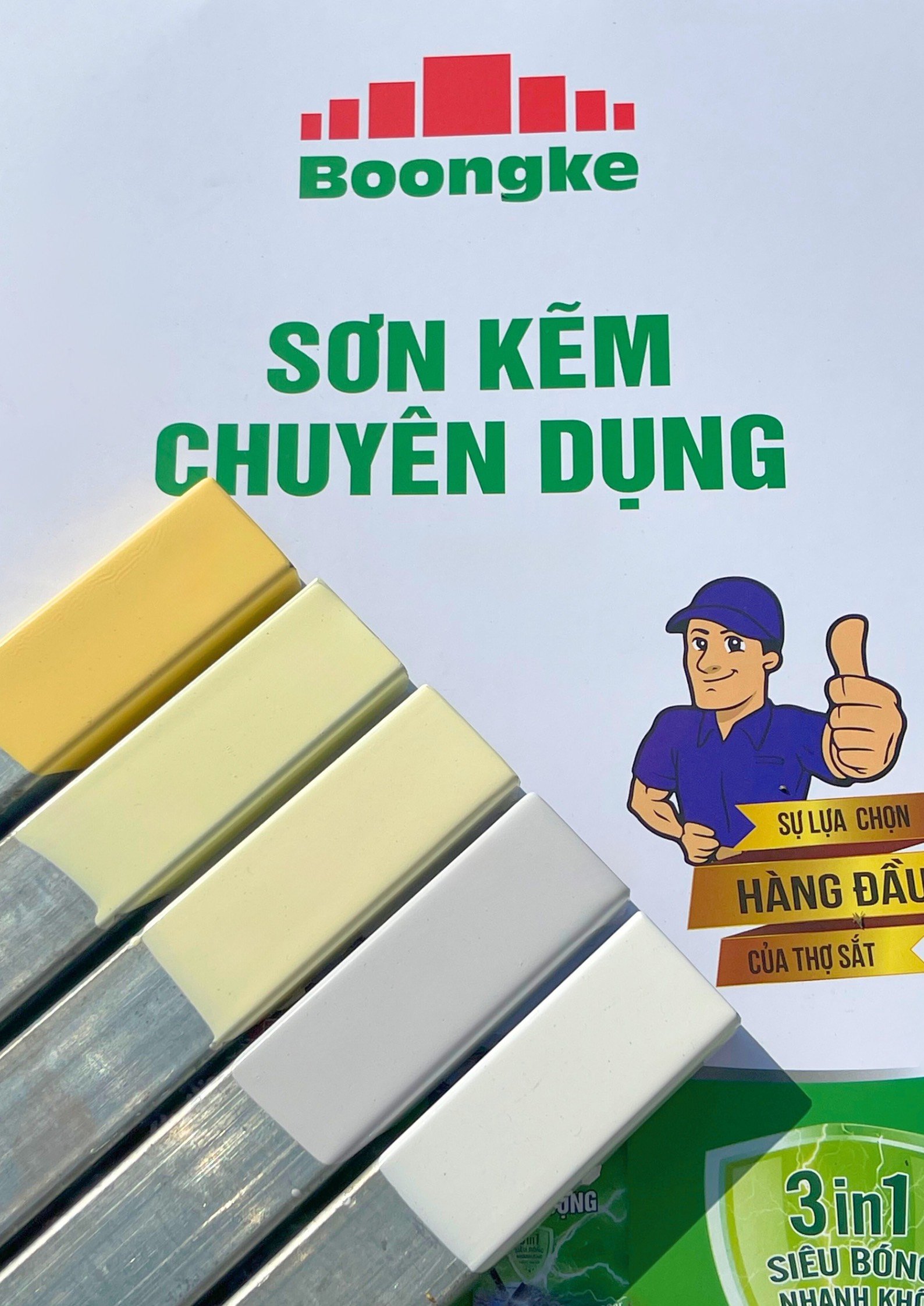 SƠN KẼM SIÊU BÓNG 1 THÀNH PHẦN SIÊU BÓNG BOONGKE Là loại sơn tổng hợp đặc biệt dùng cho việc bảo vệ bề mặt khó bám dính như thép mạ kẽm, betong, gỗ, kính,… sử dụng trong các công trình như nhà thép, cổng sắt, cửa sắt, bảo vệ, chống rỉ, sơn cho tole mạ kẽm, inox, gỗ…Sơn phủ màu trực tiếp lên bề mặt, không cần sơn lót.